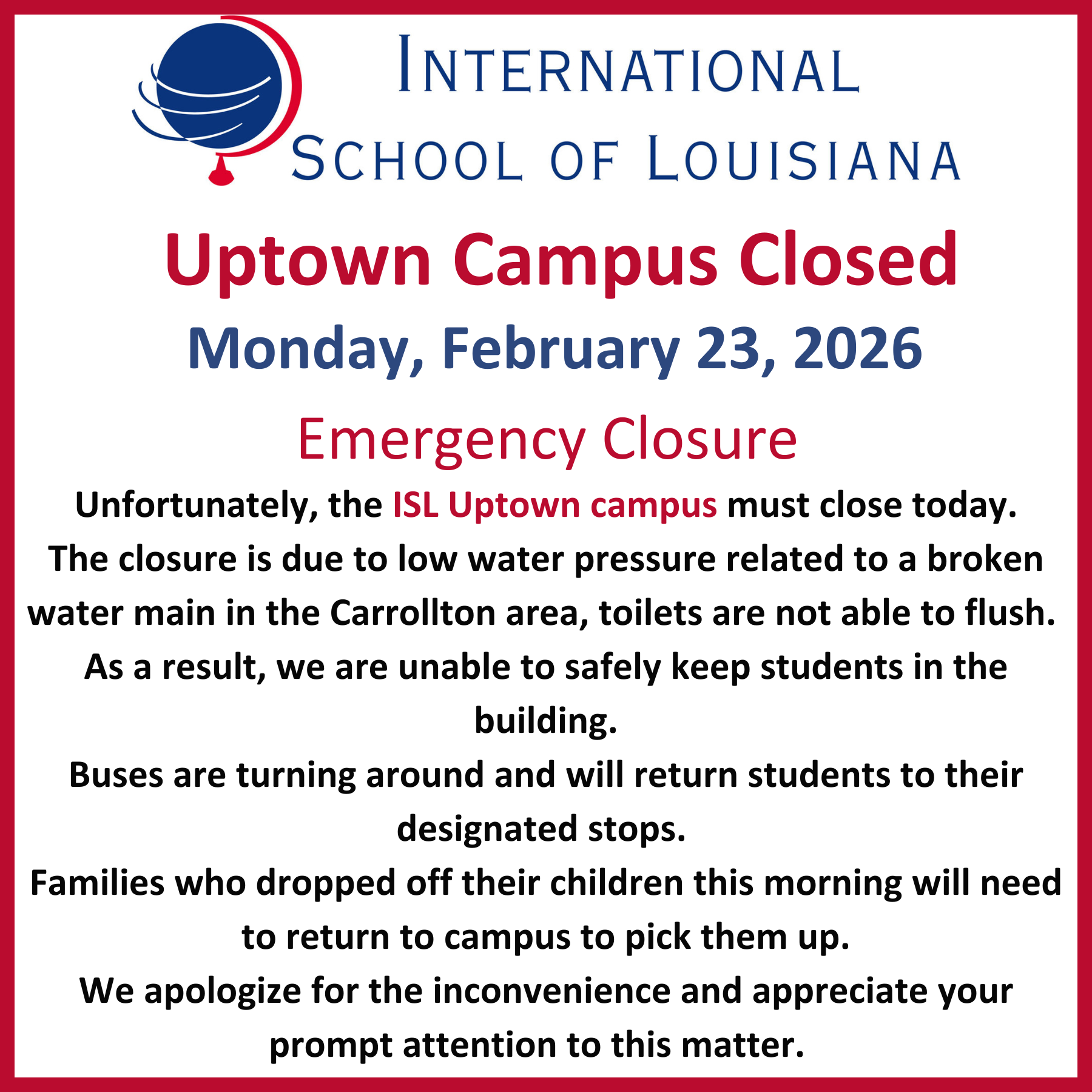 Unfortunately, the ISL Uptown campus must close today.