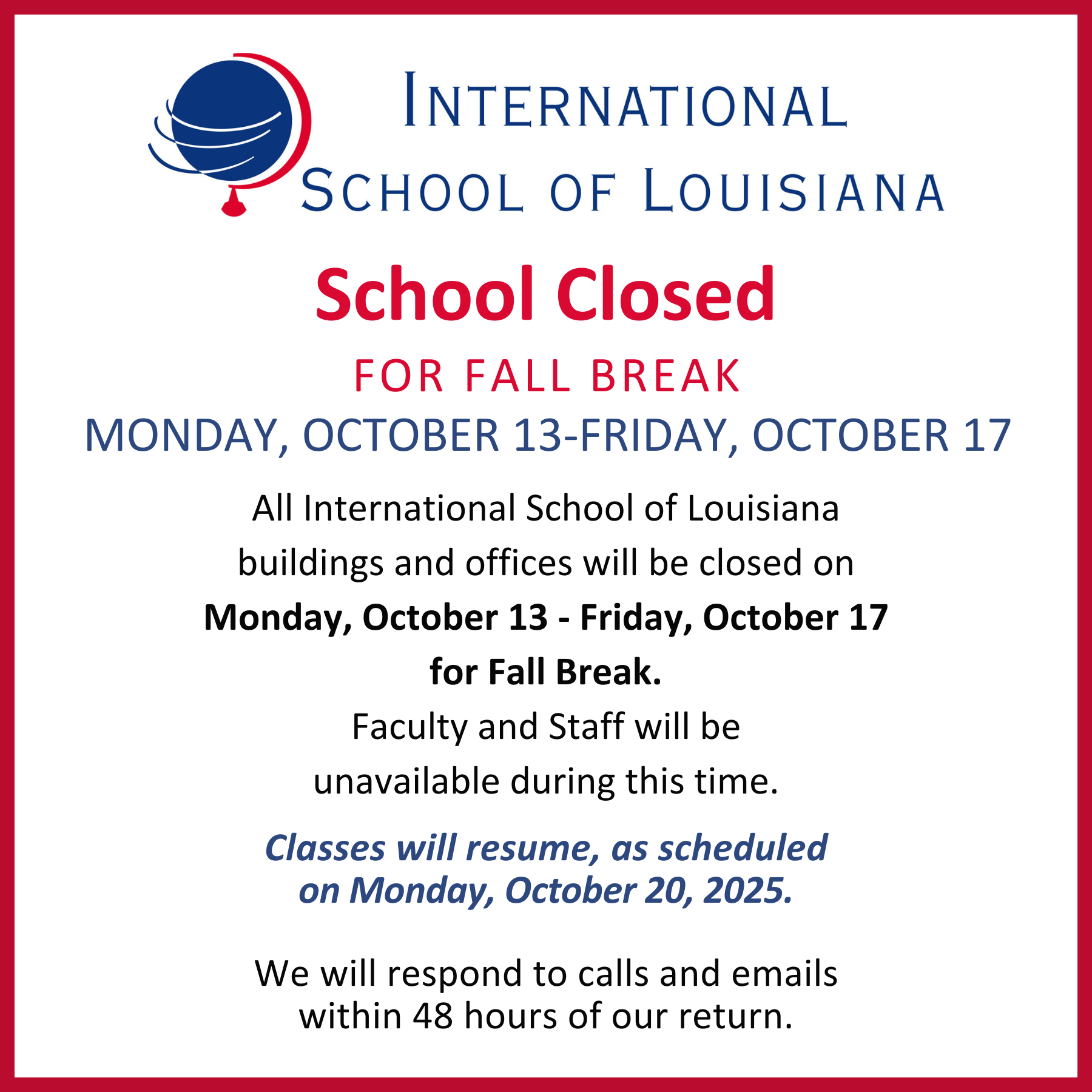 Faculty and staff will be unavailable during this time. ISL buildings and offices will reopen on Monday 10/20/2025 when classes resume. Calls and emails will be returned within 48 hours of our return.