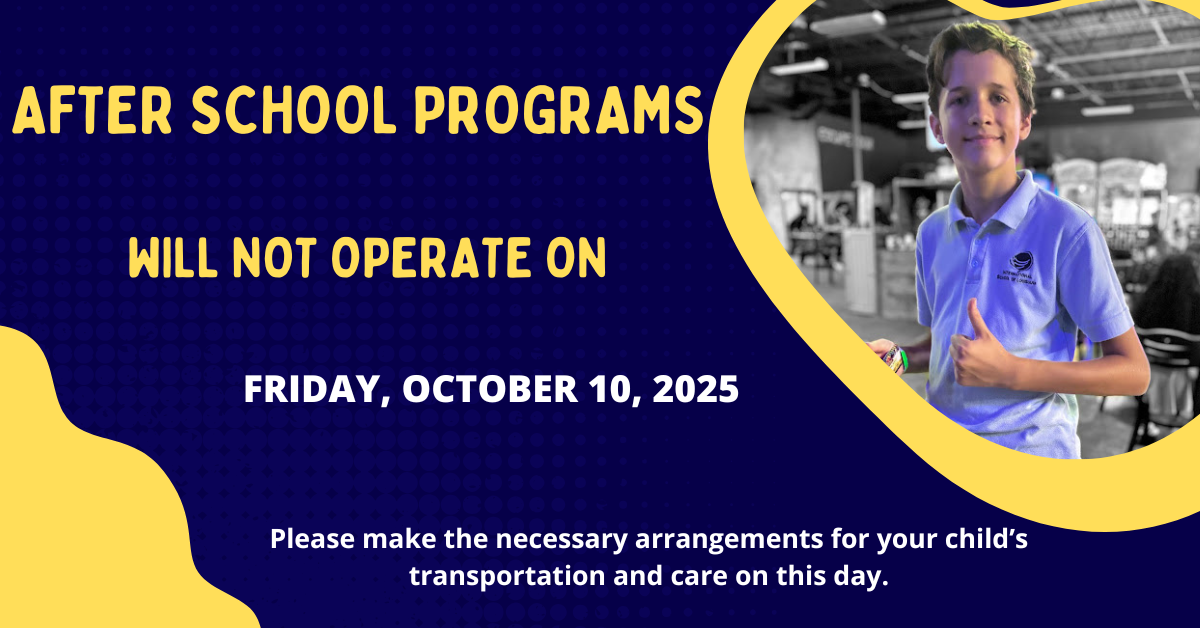 After school programs will not operate on Friday October 10, 2025. Please make the necessary arrangements for your child's transportation and care on this day.