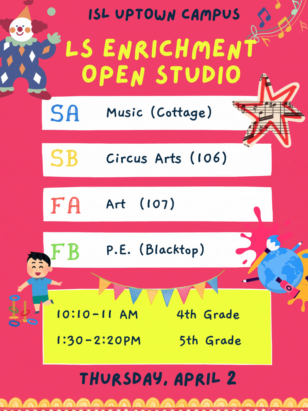 April 2: Lower School Enrichment Open Studio (Families invited)